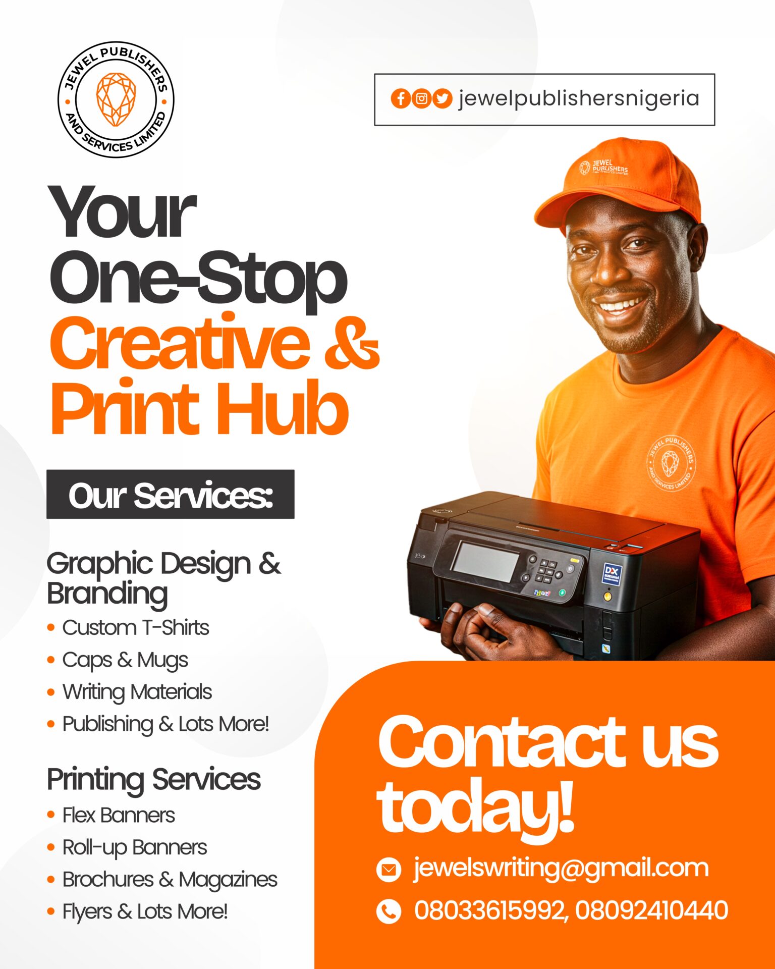 Founded in 2011, Jewel Publishers and Services Nigeria is a professional print, media, and branding solutions provider delivering creative design, printing, publishing, and promotional services across Nigeria.